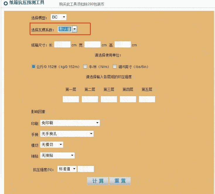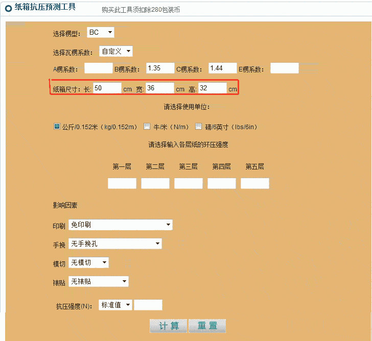 纸箱的周长、长宽比及高度对空箱抗压均有很大影响,使用此工具时需要准确输入纸箱的尺寸。若是使用英寸单位,请先转化成厘米后再输入。如图五