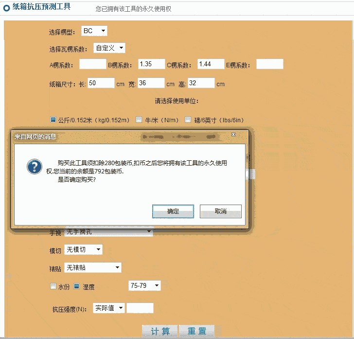 2、 打开抗压强度测算工具,点击计算,此时界面会跳出一个窗口,点击确认,系统将扣除你280个包装币,您拥有该工具的永久使用权。如图十六