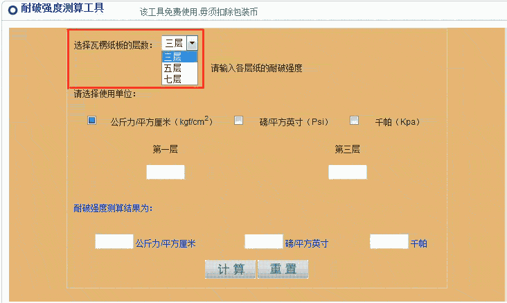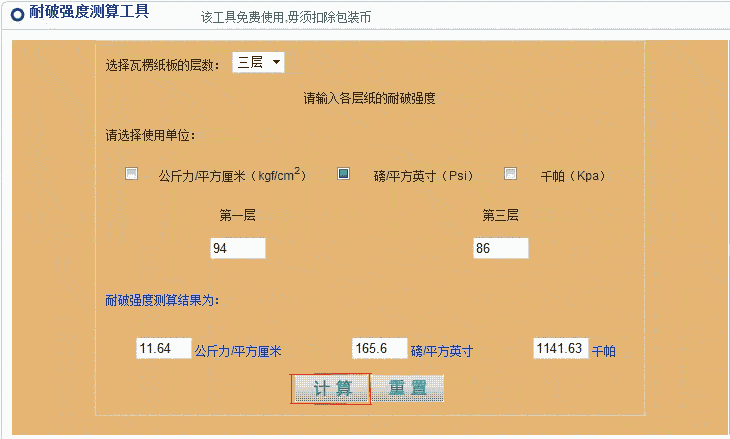 耐破强度测算工具是用来预测瓦楞纸板耐破强度值的在线使用的工具软件。您只需输入瓦楞纸板面纸、中层垫纸和底纸的耐破强度值,即可测算出该瓦楞纸板的耐破强度值。