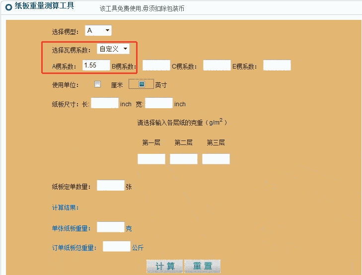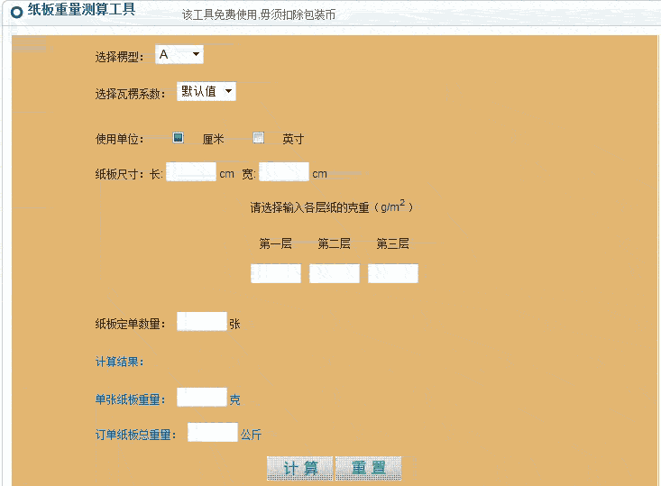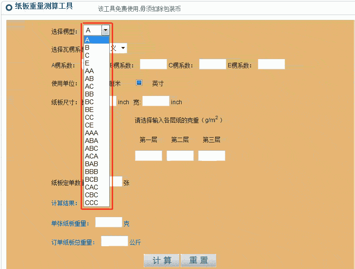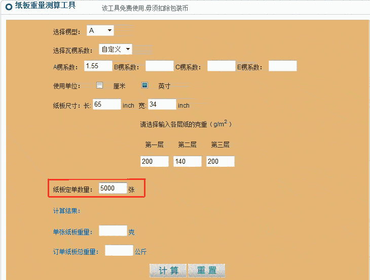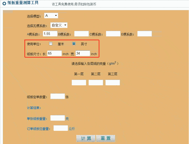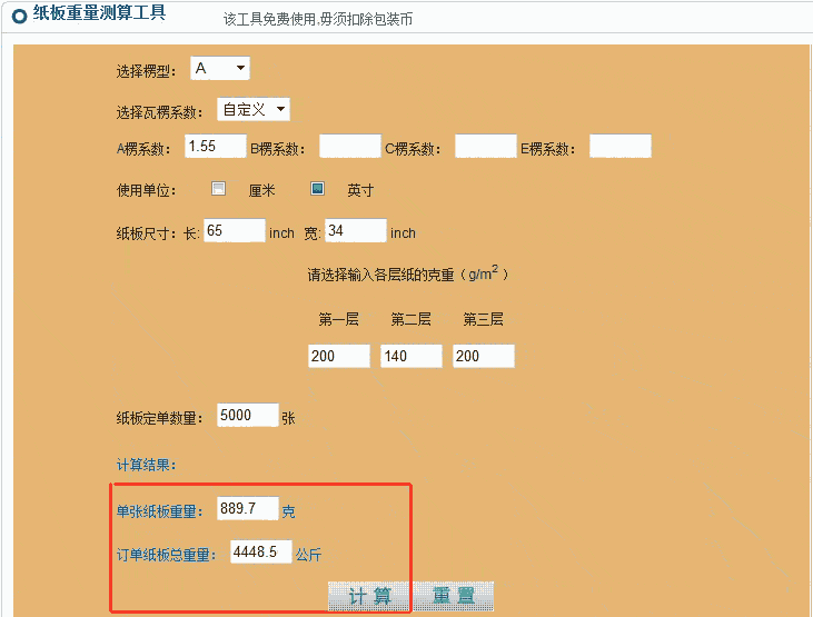 5.2、如果想继续测算其它类型瓦楞纸板的重量,可先点击“重置”按钮,界面所有数据将清零。再按照以上说明输入相应值。点击“计算”按钮。