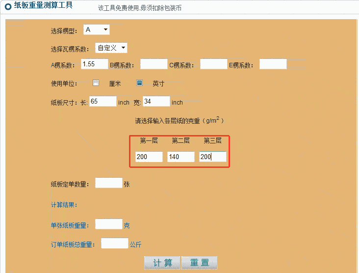 瓦楞纸板重量测算工具通过对组成纸板的各层纸及粘合剂的重量进行累加来获得瓦楞纸板重量。使用此工具软件的前提条件是须知道各层纸的克重和楞型组合。