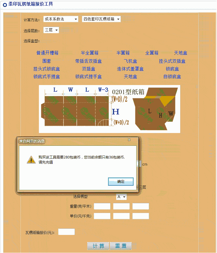 2、 打开瓦楞纸箱报价工具,点击计算,此时界面会跳出一个窗口,点击确认,系统将扣除你280个包装币,您拥有该工具的永久使用权。如图十八