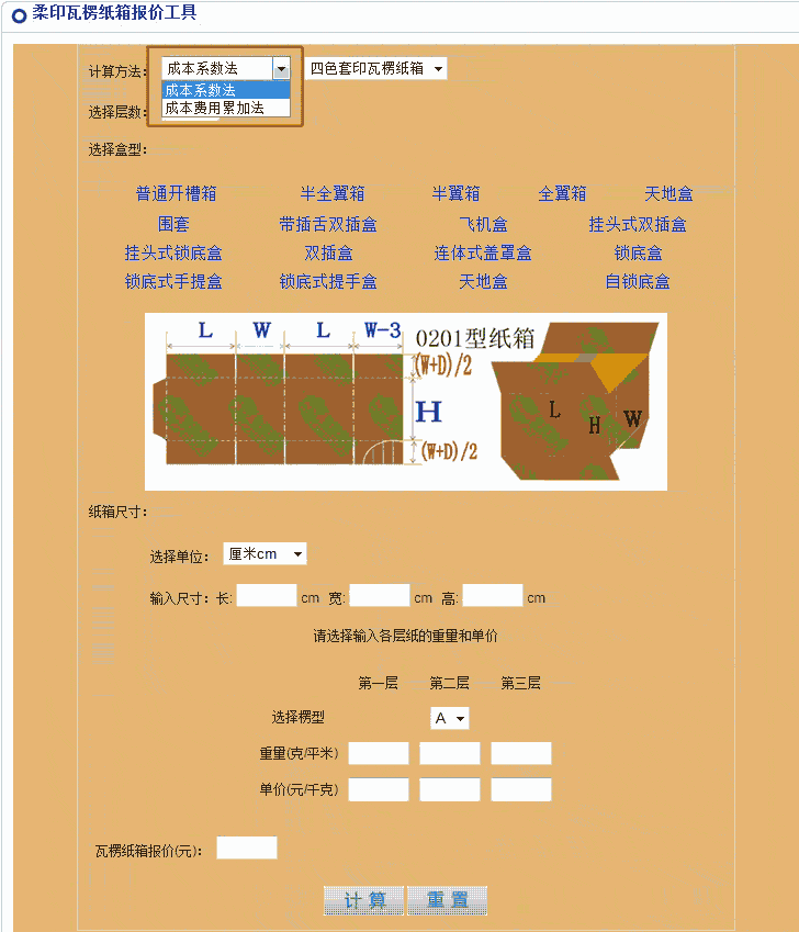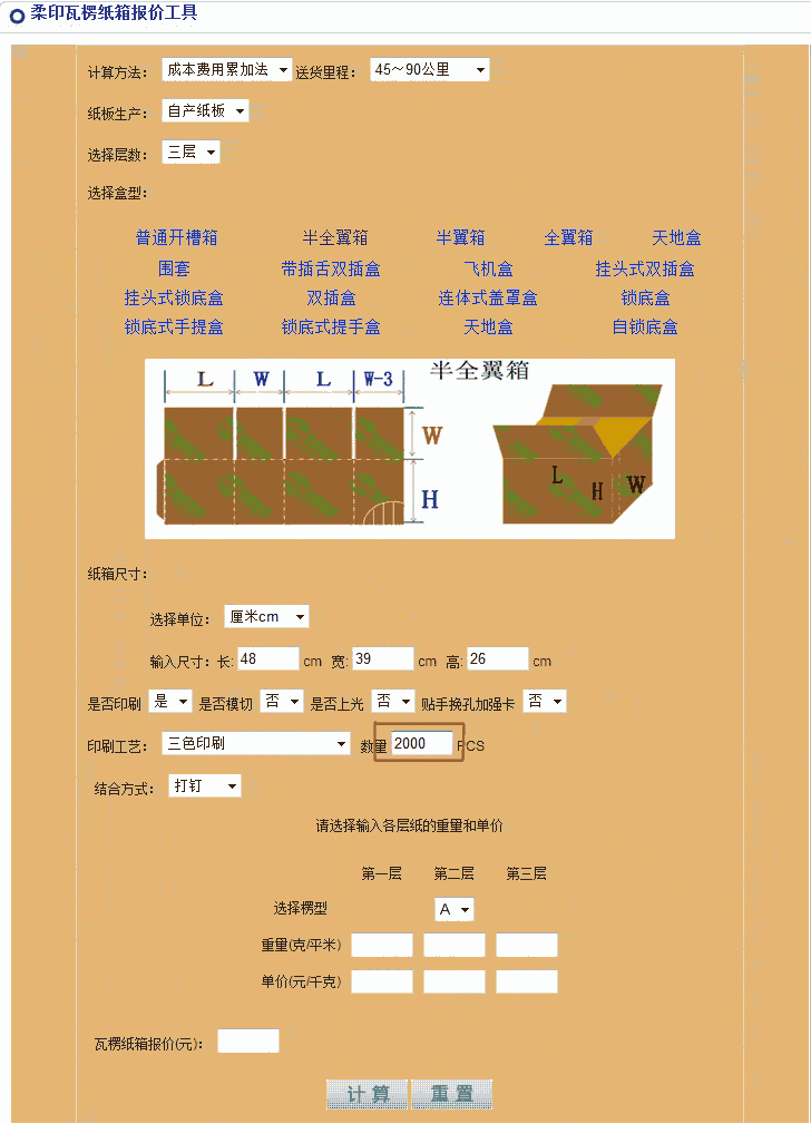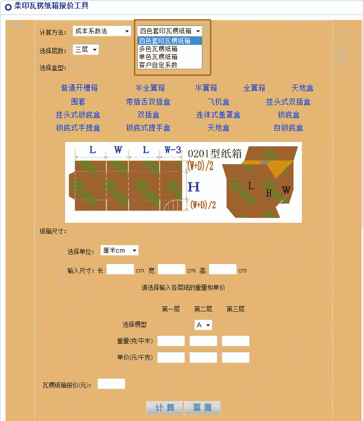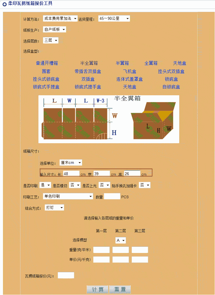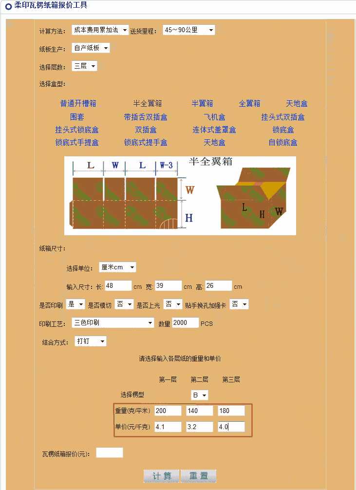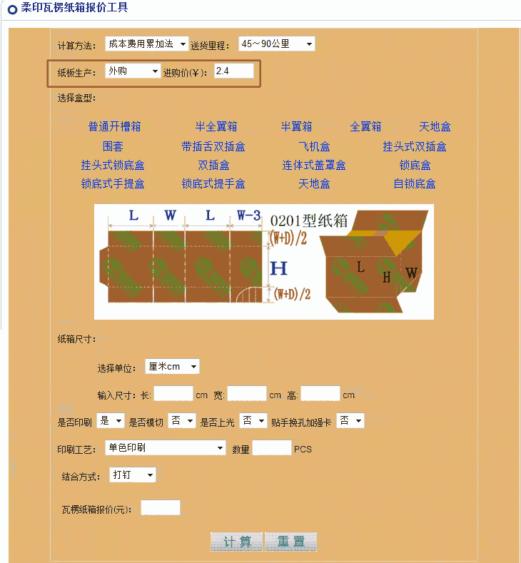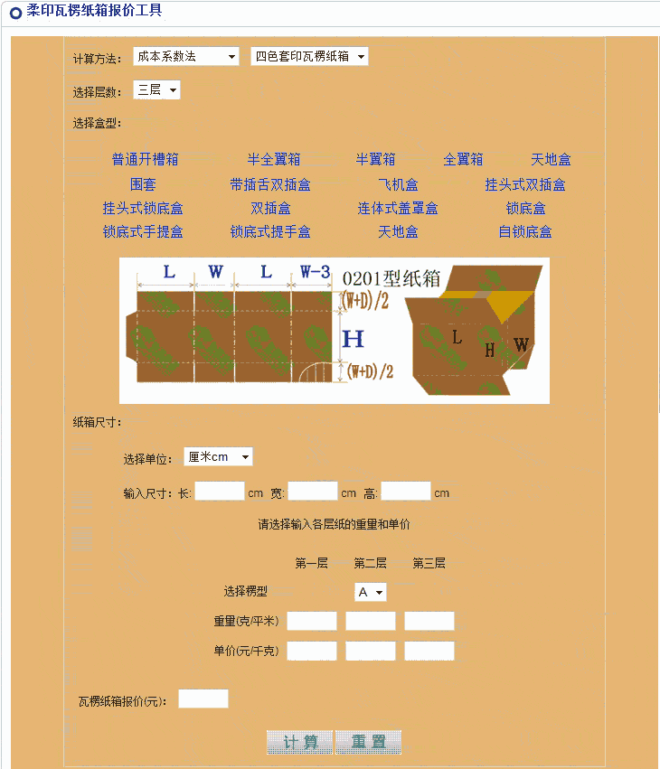 15.2、如果想继续测算其它纸箱的报价,可先点击“重置”按钮,界面所有数据将清零。再按照以上说明输入相应值。点击“计算”按钮。