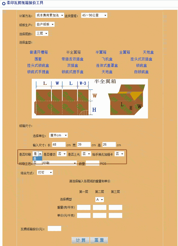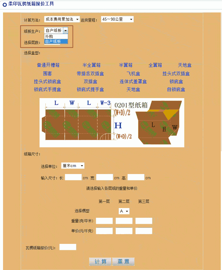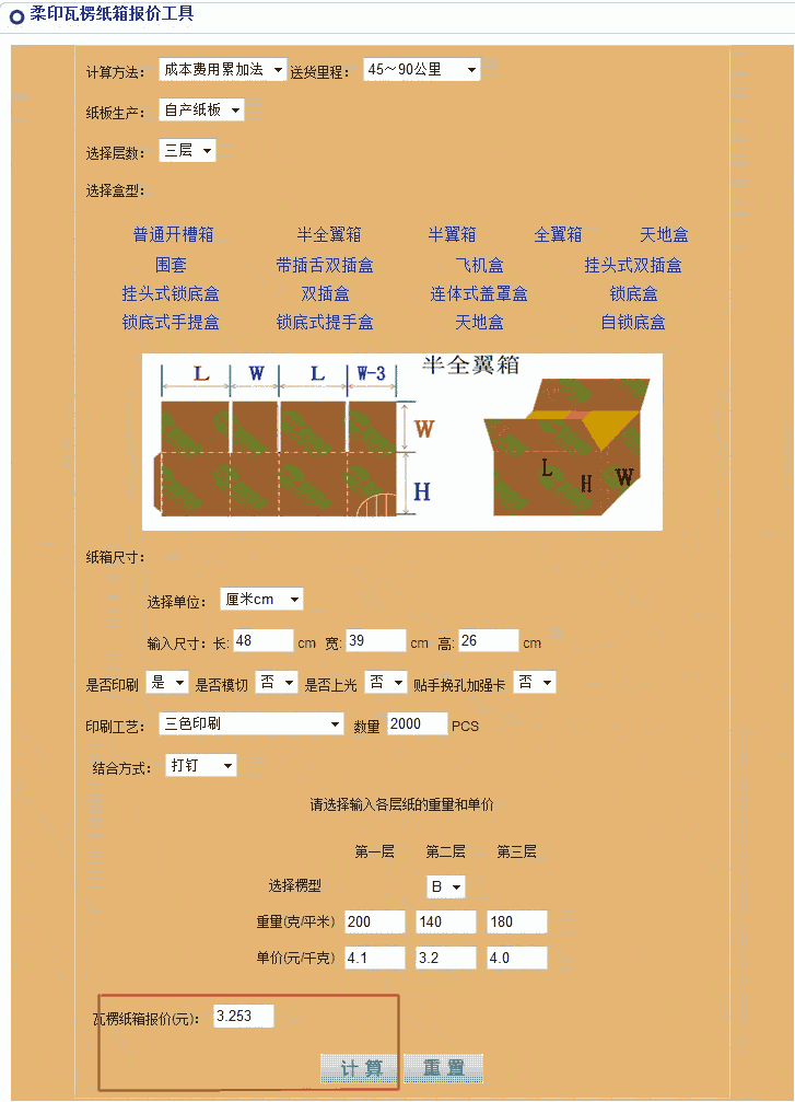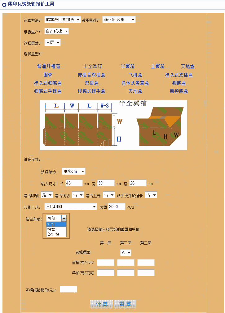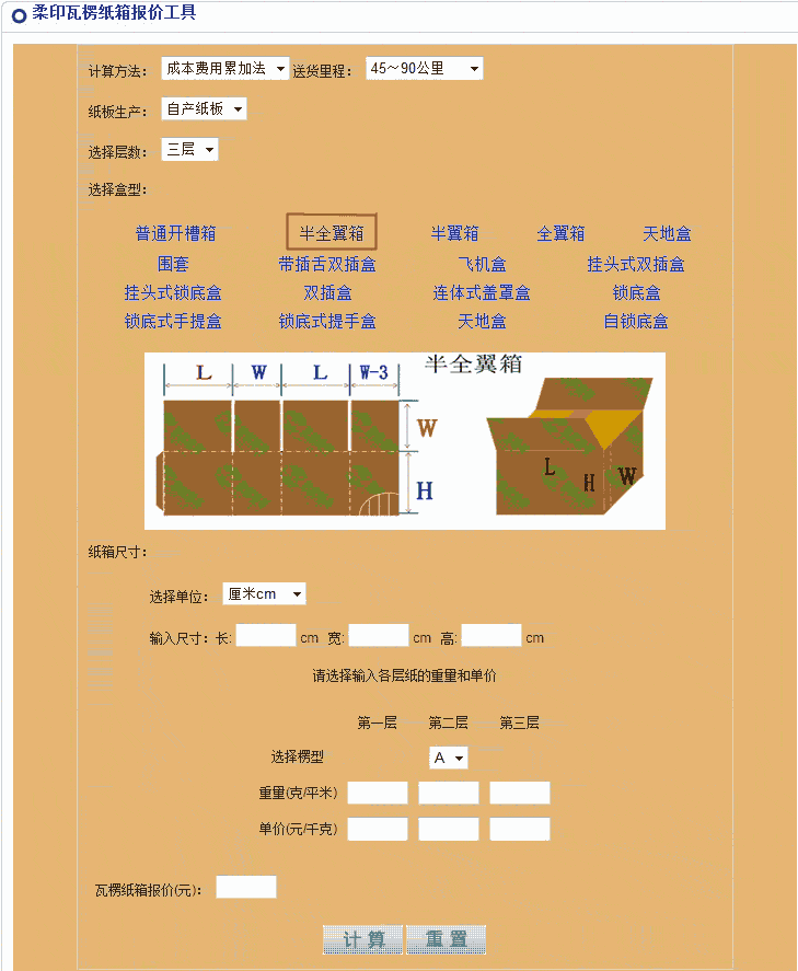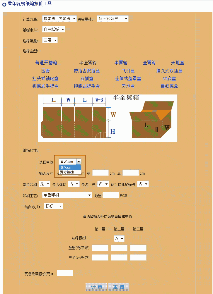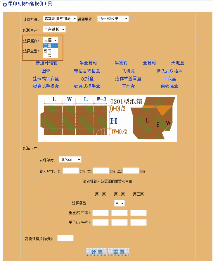 15.2、如果想继续测算其它纸箱的报价,可先点击“重置”按钮,界面所有数据将清零。再按照以上说明输入相应值。点击“计算”按钮。