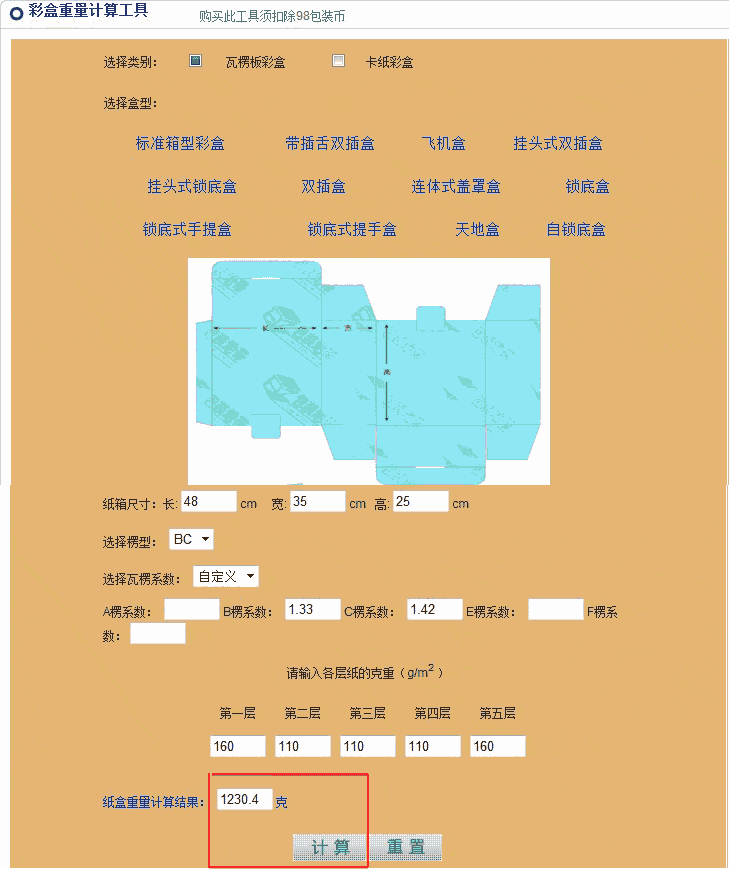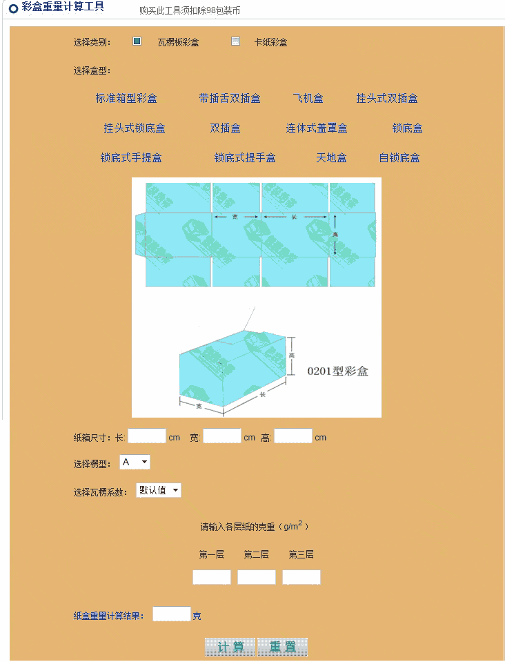 您需支付98个包装币,就能获得彩盒重量测算工具软件的永久使用权。购买此工具的具体操作方法如下: