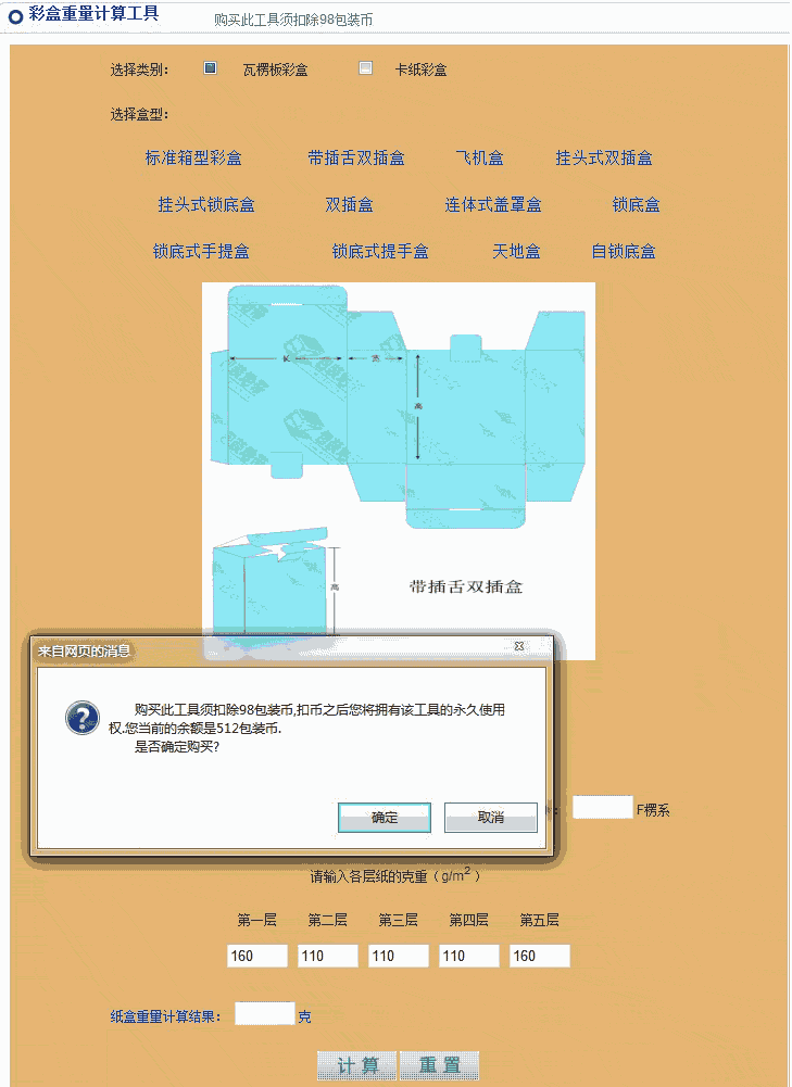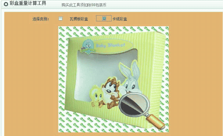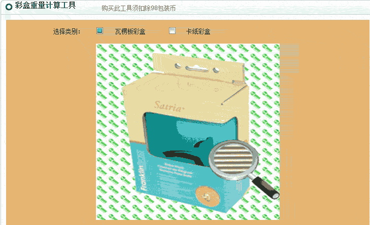 2、 打开彩盒重量测算工具,点击计算,此时界面会跳出一个窗口,点击确认,系统将扣除你98个包装币,您拥有该工具的永久使用权。如图十