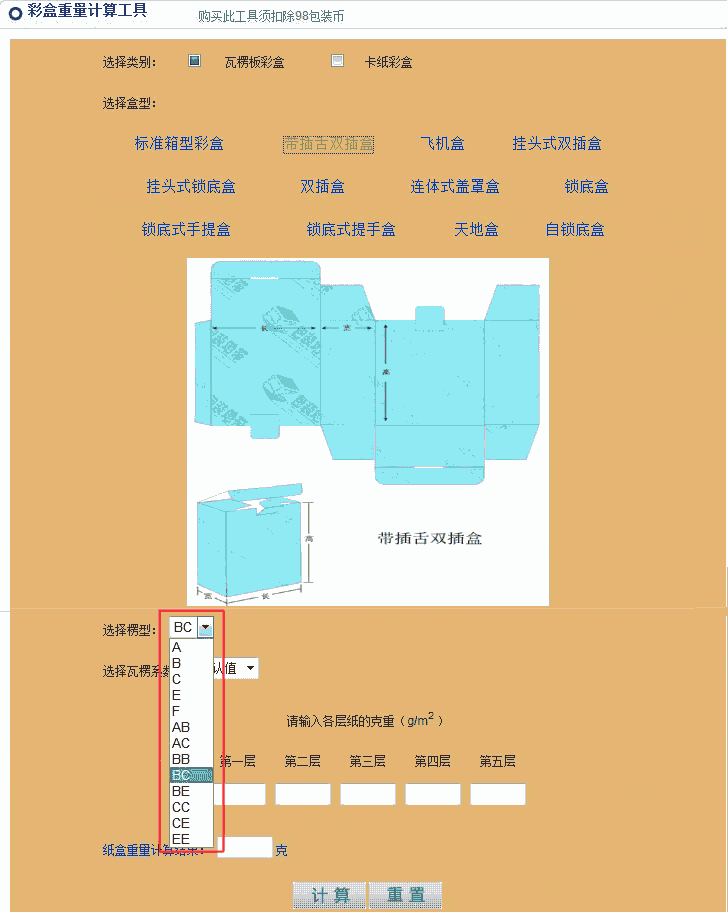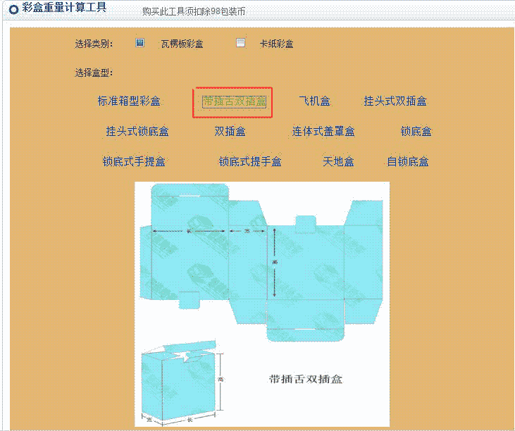 彩盒有很多种盒型结构,同样容积不同盒型的重量相差很大。本工具选取了十二种最典型的盒型,并且每种盒型均有提示图片。如图四