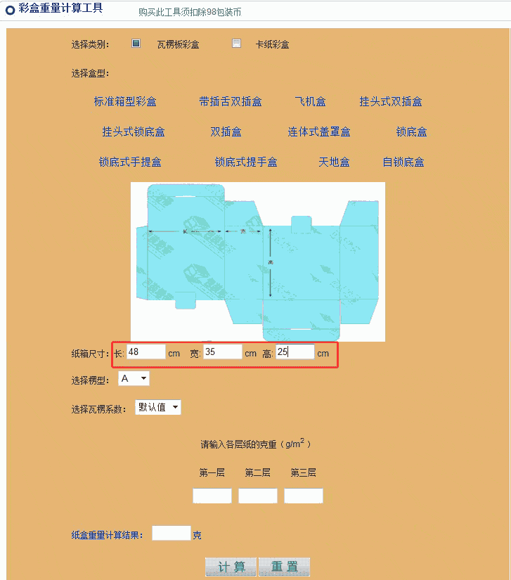 9.2、如果想继续测算其它类型彩盒的重量,可先点击“重置”按钮,界面所有数据将清零。再按照以上说明输入相应值。点击“计算”按钮。