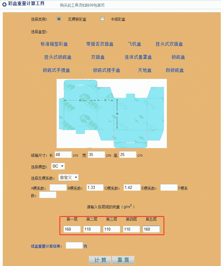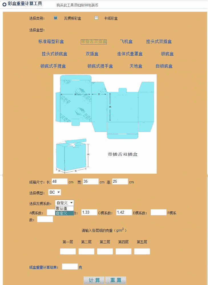 彩盒重量测算工具通过对组成纸板的各层纸及粘合剂的重量进行累加来获得彩盒重量。使用此工具软件的前提条件是须知道各层纸的克重和楞型组合。