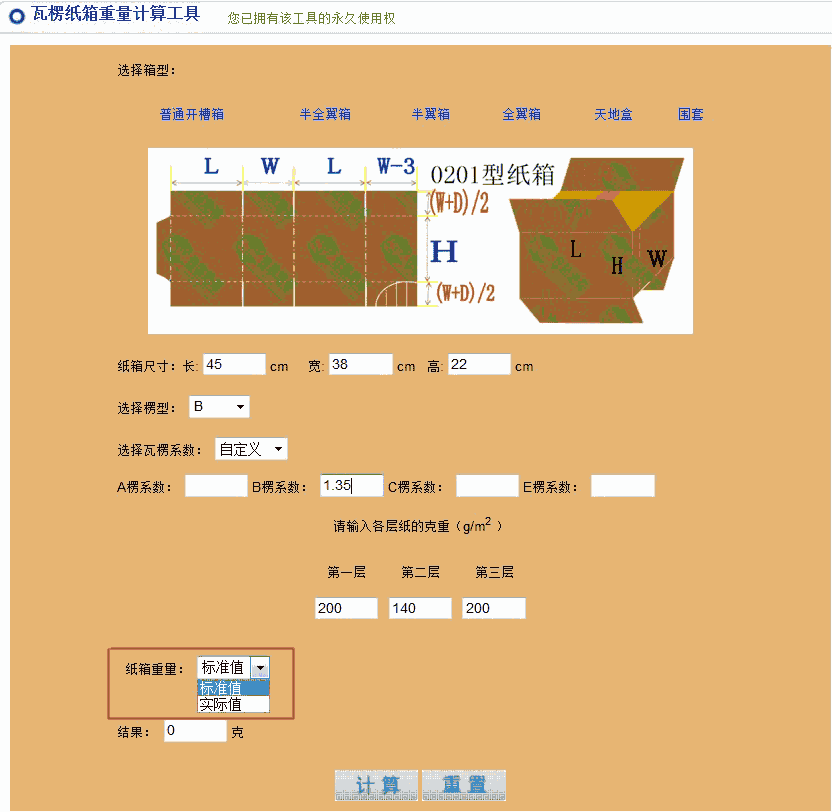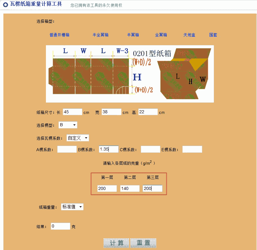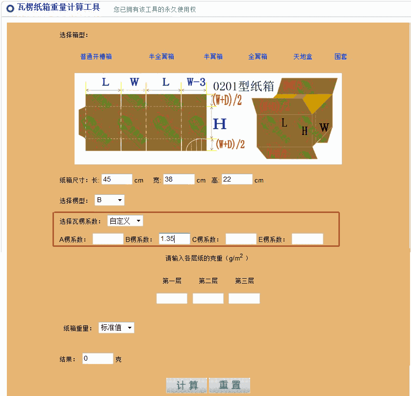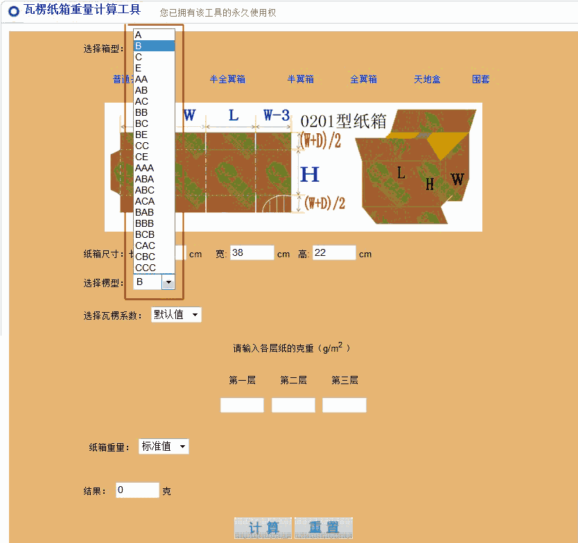 纸箱重量测算工具通过对组成纸板的各层纸及粘合剂的重量进行累加来获得纸箱重量。使用此工具软件的前提条件是须知道各层纸的克重和楞型组合。