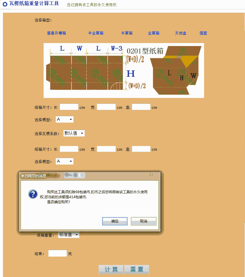 2、 打开纸箱重量测算工具,点击计算,此时界面会跳出一个窗口,点击确认,系统将扣除你98个包装币,您拥有该工具的永久使用权。如图十