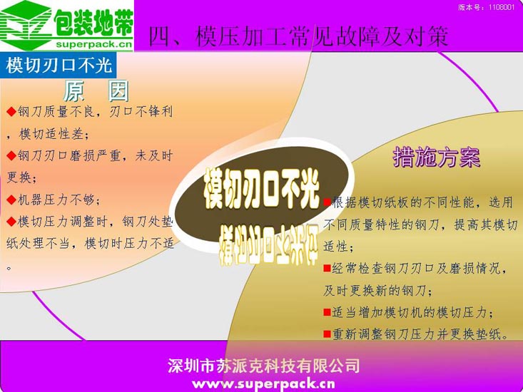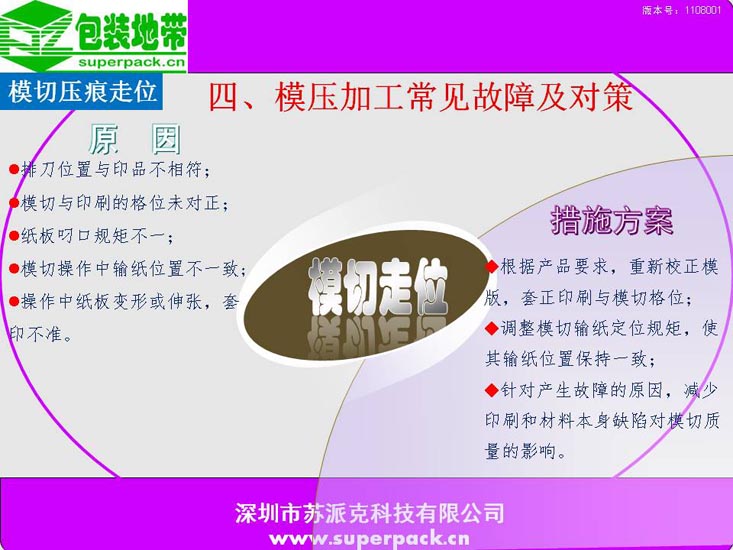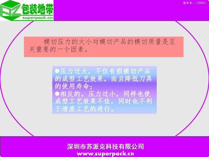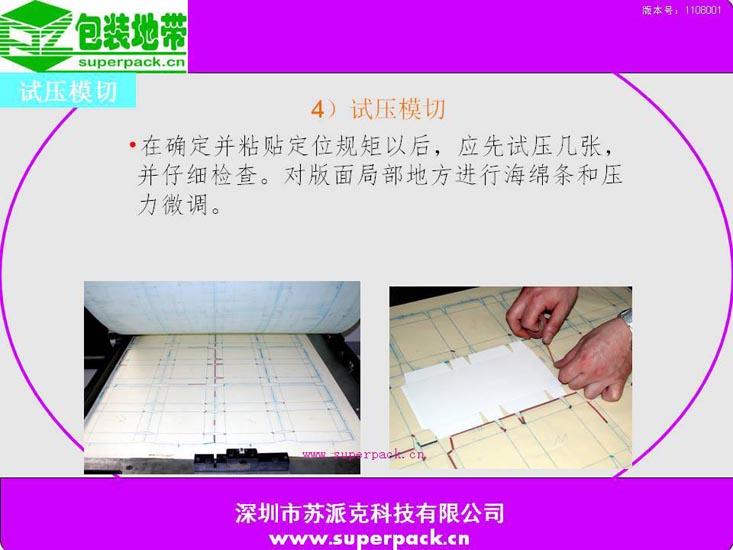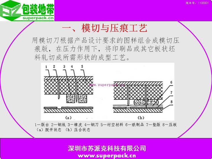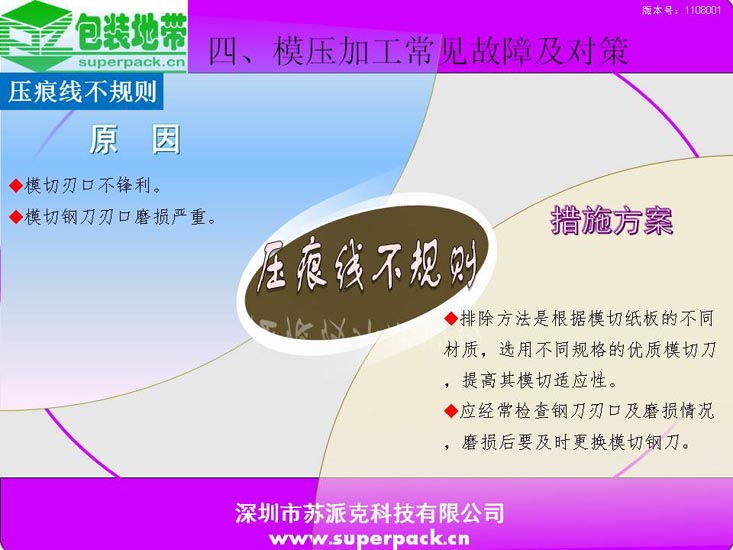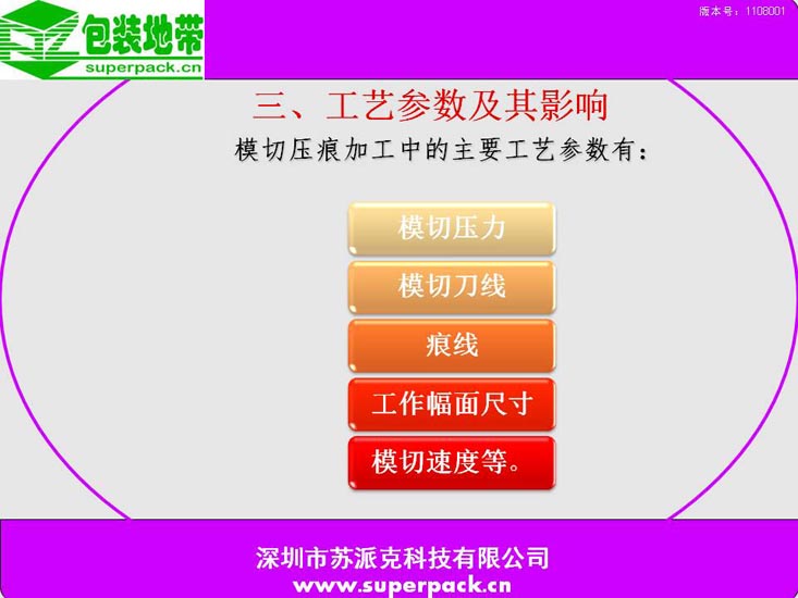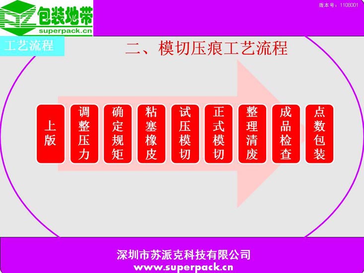 模切压痕技术是后工道一项技术含量比较高的技术。对于包装印刷品的成型和外观具有至关重要的作用。在此重点对其工艺流程、参数设置及影响、常见问题与对策等进行讲解。适用人员:后工道生产员工、生产管理人员、技术人员、采购及其它相关人员