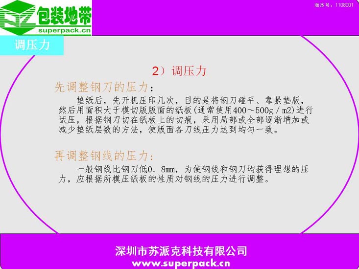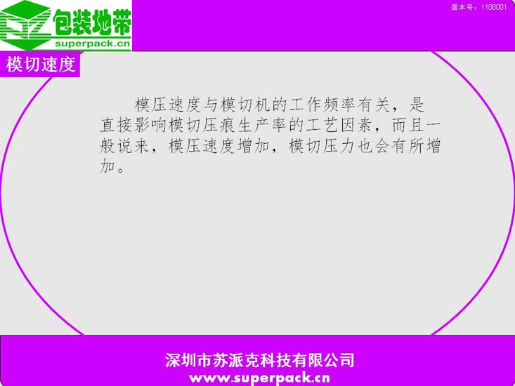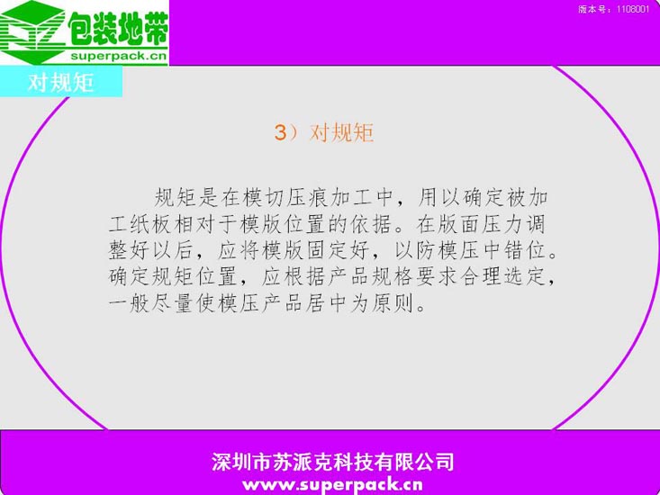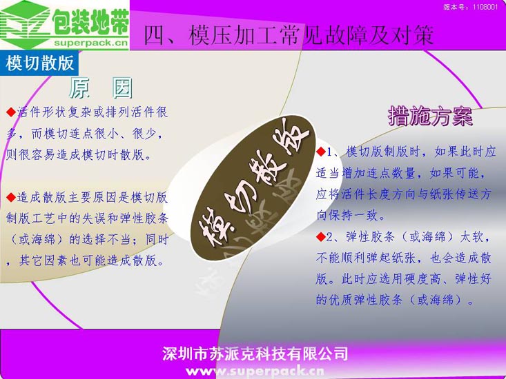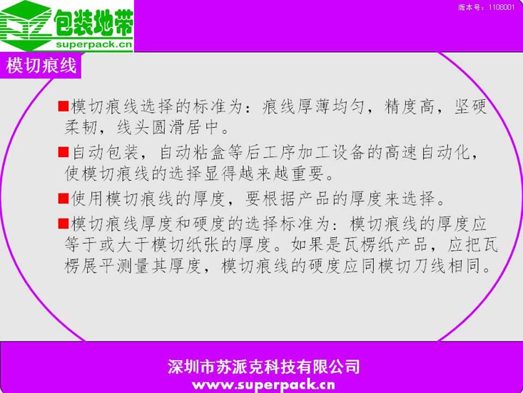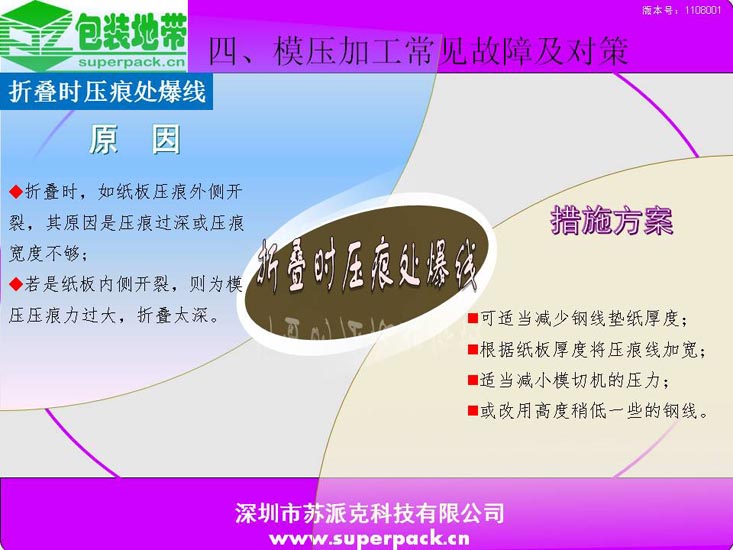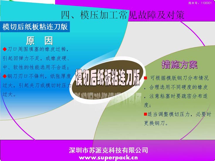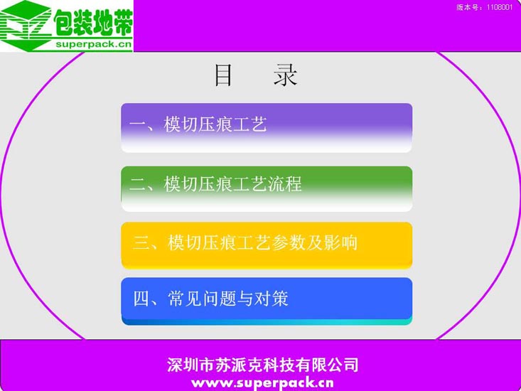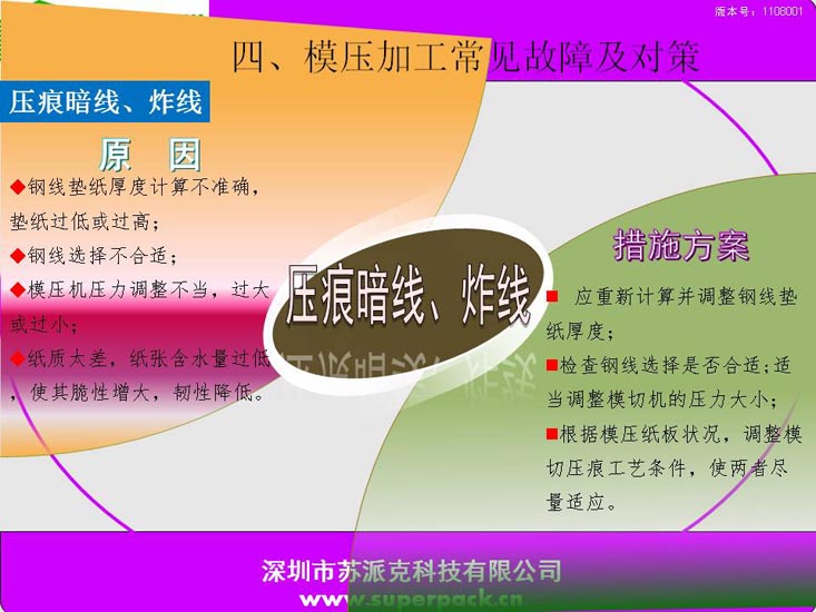 模切压痕技术是后工道一项技术含量比较高的技术。对于包装印刷品的成型和外观具有至关重要的作用。在此重点对其工艺流程、参数设置及影响、常见问题与对策等进行讲解。适用人员:后工道生产员工、生产管理人员、技术人员、采购及其它相关人员