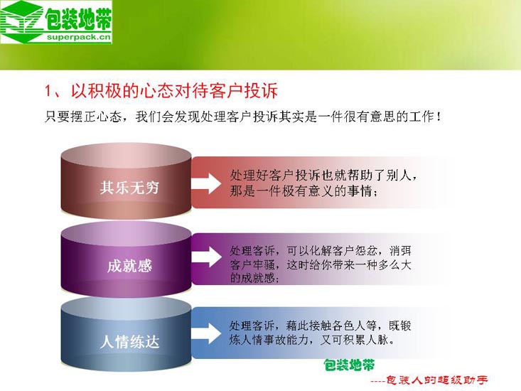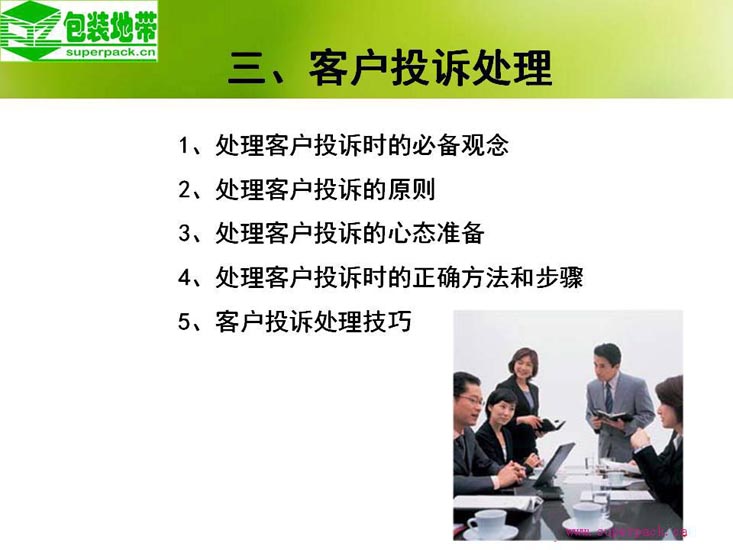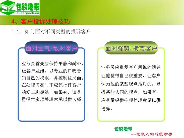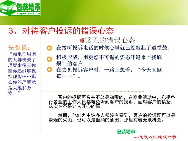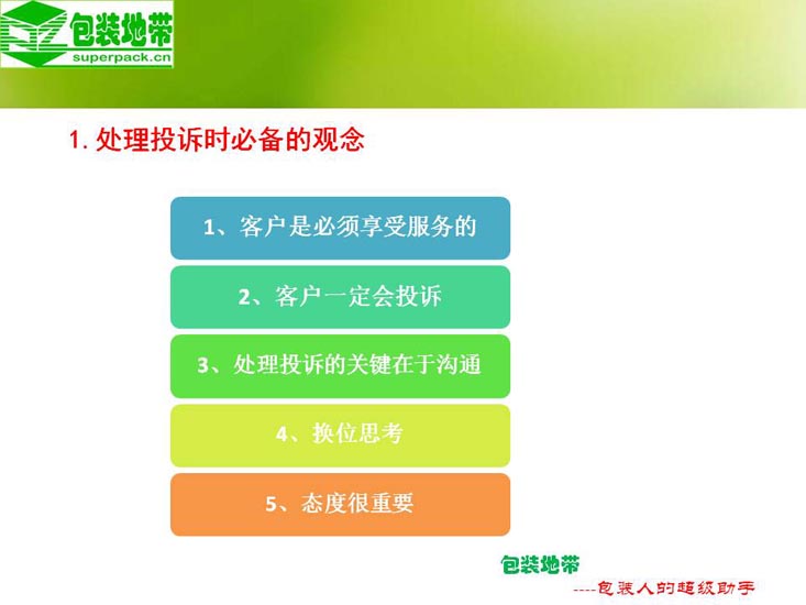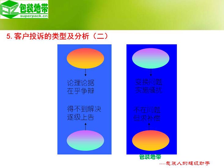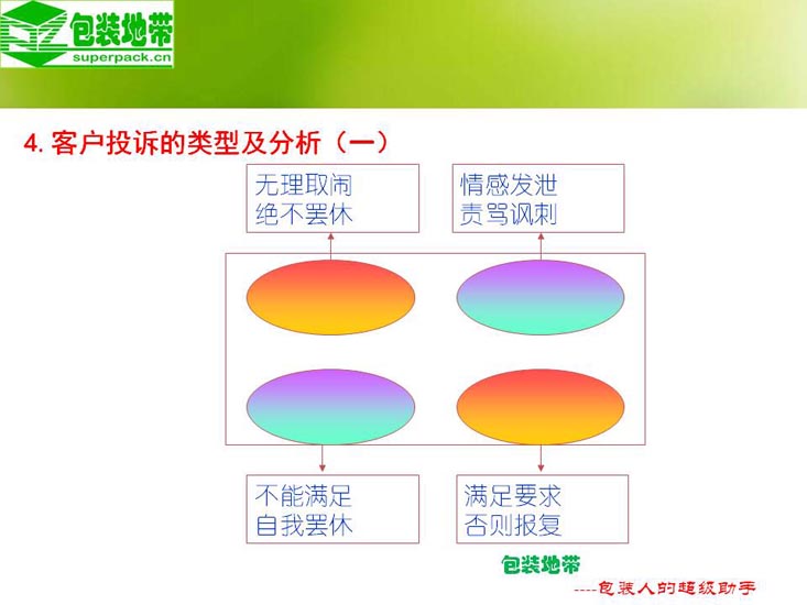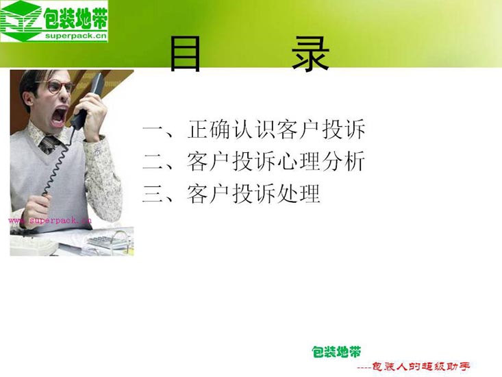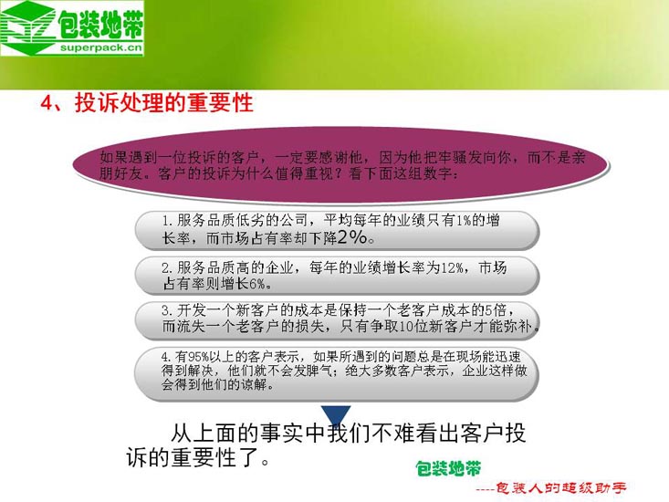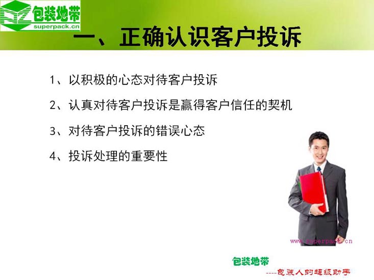 随着市场竞争日趋白日化,提高客服人员的素质近在眉睫。因此企业有必要对员工处理客户投诉的技巧进行培训与考核。适用人员:印刷包装企业业务人员、跟单人员、客服及其它相关人员