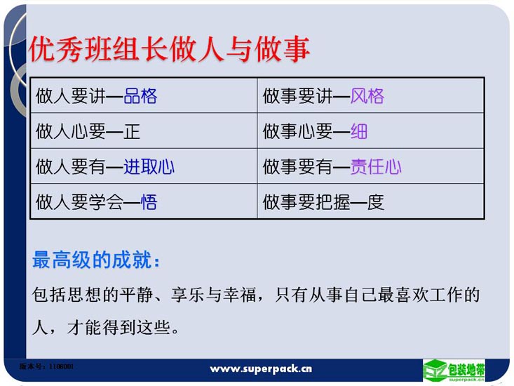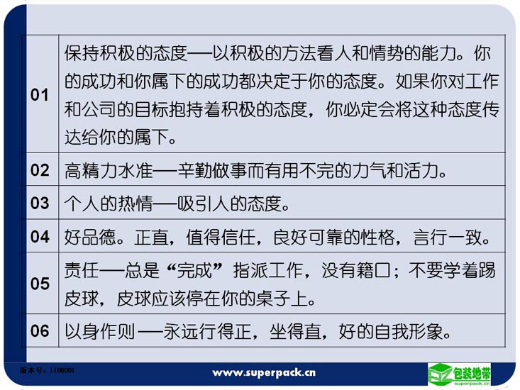 班组长的综合素质决定着团队的战斗力,因此提高班组长的综合素质对企业来说非常重要。本培训为班组长如何提高专业技能、驾奴员工的方法提供指引。并对企业中层管理人员如何构建一个高效的团队提出一些解决方案。适合人员:企业各级管理人员,储备管理人员