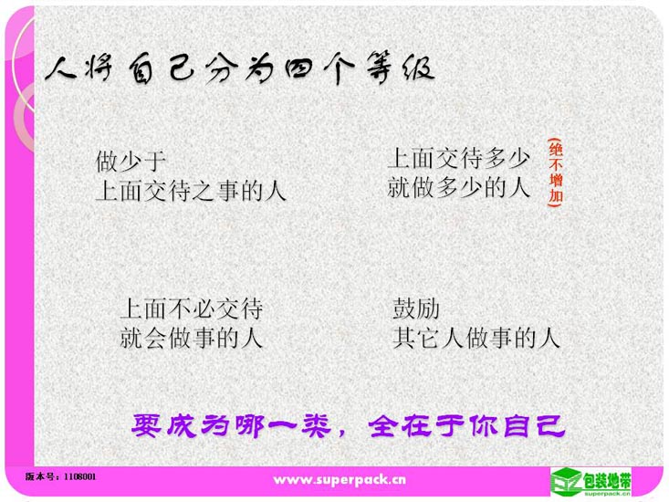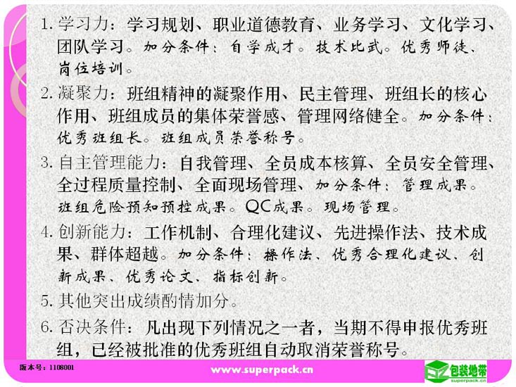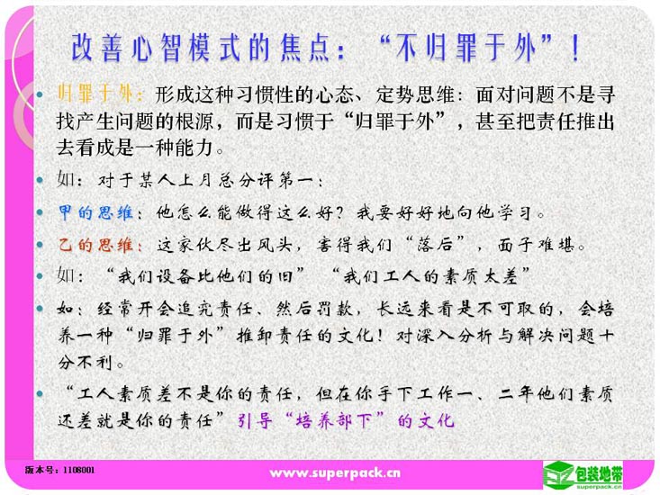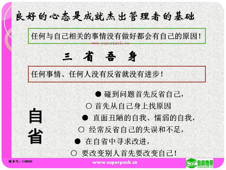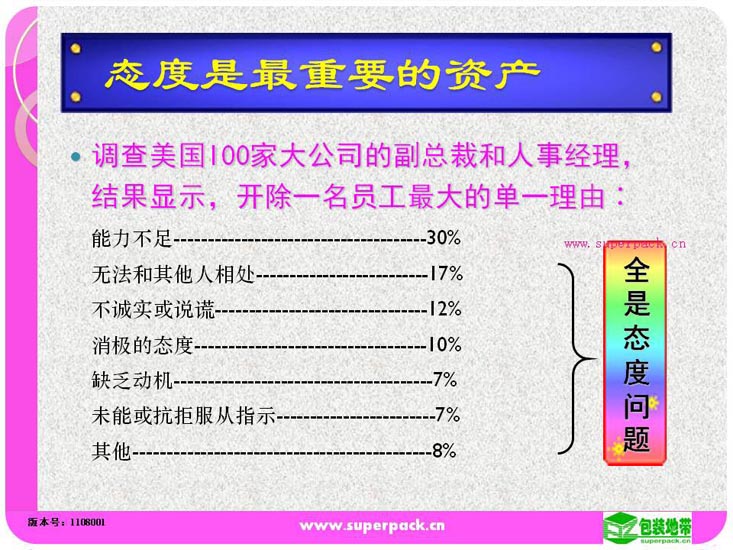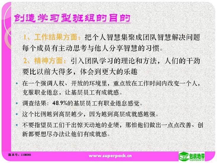 态度决定一切,良好的态度营造良好的团队氛围。成功的班组长所在的团队一定是学习型的团队。本培训还就如何创建学习型的班组提供指引。适合人员:企业各级管理人员,储备管理人员